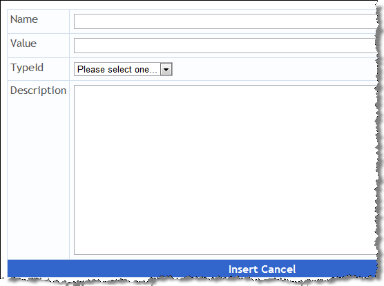 On Keywords page click on Insert New Item would bring Add New Keyword form where Keyword Name and Type Id must be provided: