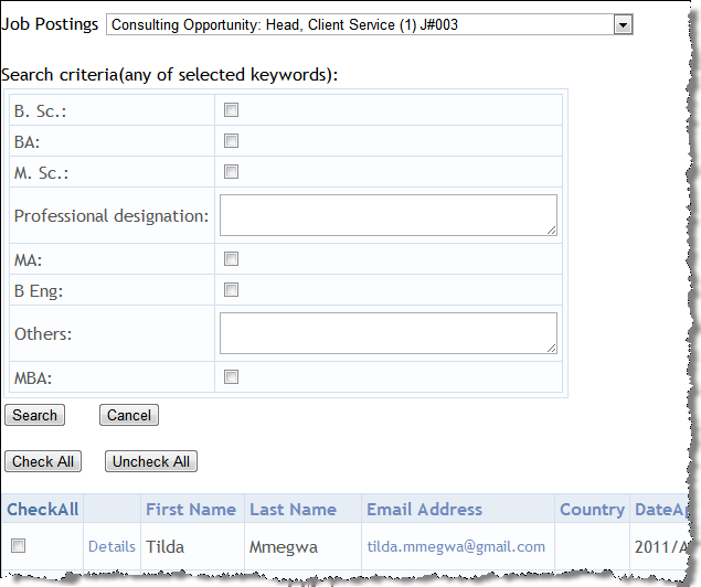 On TDI Admin site job applicants can be searched and filtered by selecting keywords, attached to a particular job posting and click on search button: